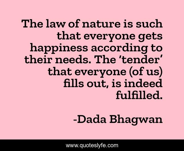 This page presents the quote "The law of nature is such that everyone gets happiness according to their needs. The ‘tender’ that everyone (of us) fills out, is indeed fulfilled.". Author of this quote is Dada Bhagwan. This quote is about fulfilled, spiritual, happiness, nature,.