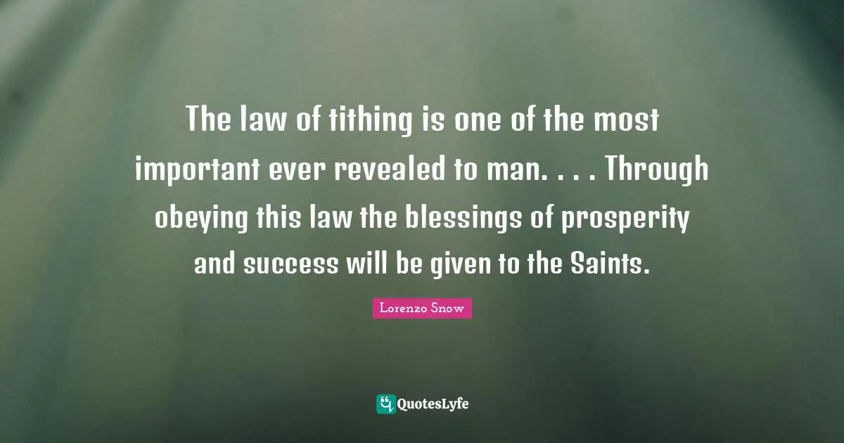 This page presents the quote "The law of tithing is one of the most important ever revealed to man. . . . Through obeying this law the blessings of prosperity and success will be given to the Saints.". Author of this quote is Lorenzo Snow. This quote is about success, tithing, important, men, given, obeying, law, prosperity, blessing,.