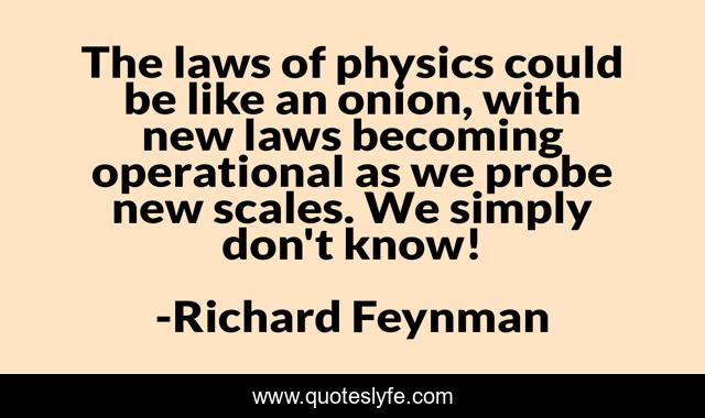 This page presents the quote "The laws of physics could be like an onion, with new laws becoming operational as we probe new scales. We simply don't know!". Author of this quote is Richard Feynman. .