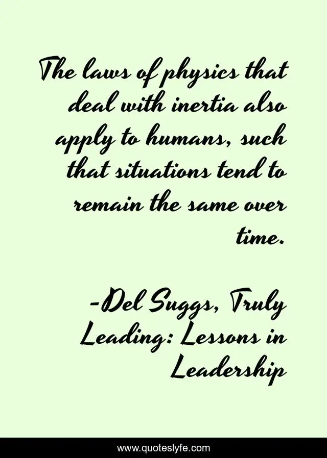This page presents the quote "The laws of physics that deal with inertia also apply to humans, such that situations tend to remain the same over time.". Author of this quote is Del Suggs, Truly Leading: Lessons in Leadership. This quote is about enthusiasm, stagnation, leadership, inspirational,.