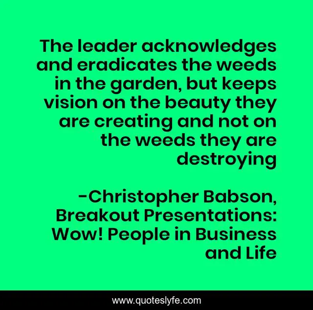 "Christopher Babson, Breakout Presentations: Wow! People in Business and Life Quotes." Quoteslyfe.com, 2025. Sun. 07 Dec. 2025. <https://www.quoteslyfe.com/quote/The-leader-acknowledges-and-eradicates-the-weeds-140926>.