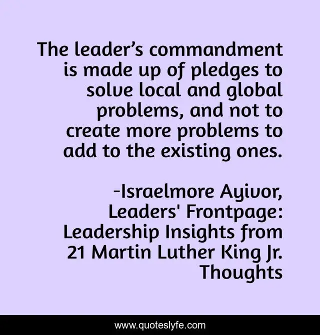 This page presents the quote "The leader’s commandment is made up of pledges to solve local and global problems, and not to create more problems to add to the existing ones.". Author of this quote is Israelmore Ayivor, Leaders' Frontpage: Leadership Insights from 21 Martin Luther King Jr. Thoughts. This quote is about commandment, food-for-thought, martin-luther, leaders, martin-luther-king-jr, create, global, problems, leader,.