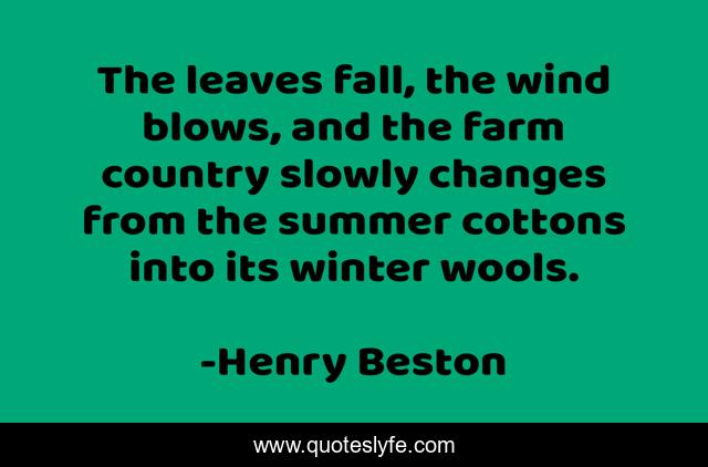 This page presents the quote "The leaves fall, the wind blows, and the farm country slowly changes from the summer cottons into its winter wools.". Author of this quote is Henry Beston. This quote is about autumn, seasons, fall,.