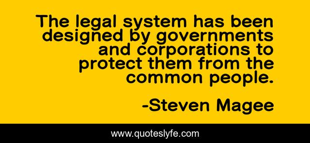 This page presents the quote "The legal system has been designed by governments and corporations to protect them from the common people.". Author of this quote is Steven Magee. This quote is about protect, protective, designed, legal-system, government, corporation, government-cover-ups, people, system,.