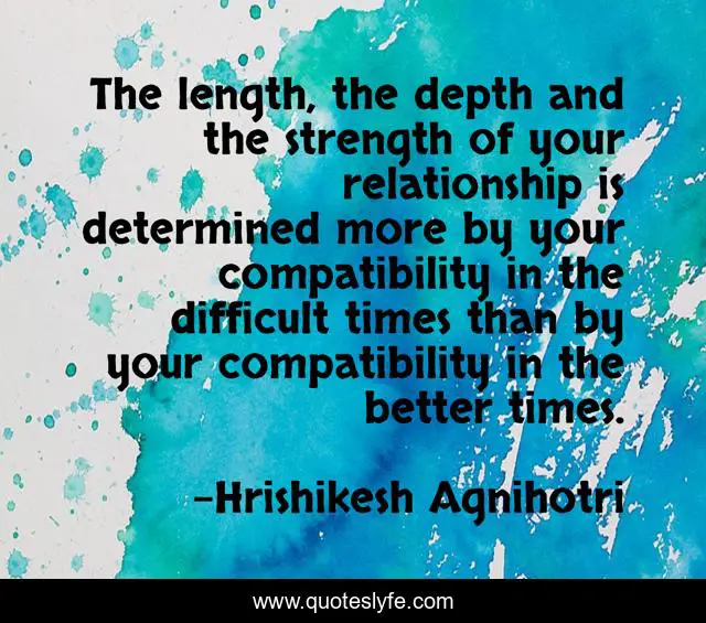 This page presents the quote "The length, the depth and the strength of your relationship is determined more by your compatibility in the difficult times than by your compatibility in the better times.". Author of this quote is Hrishikesh Agnihotri. This quote is about strength, relationship, length, times, better, depth, determined, compatibility, difficult,.