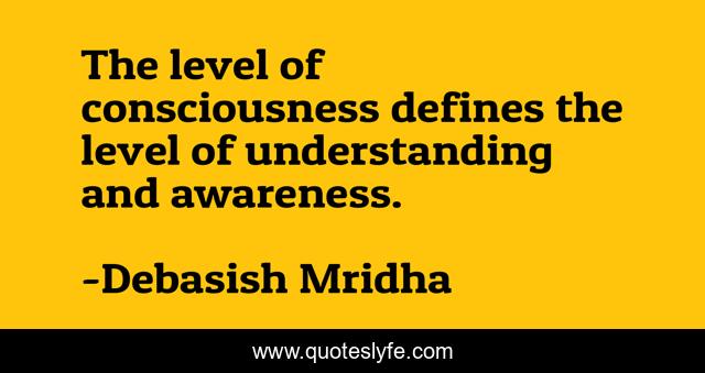 This page presents the quote "The level of consciousness defines the level of understanding and awareness.". Author of this quote is Debasish Mridha. This quote is about consciousness, philosophy, debasish-mridha, understanding, quotes, inspirational, enthusiasm, debasish-mridha-m-d, awareness,.