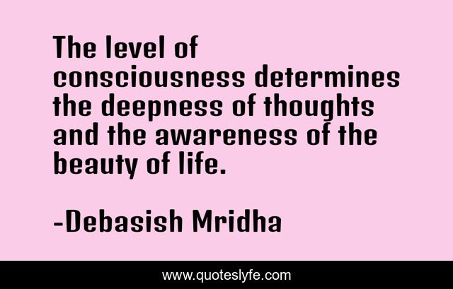 This page presents the quote "The level of consciousness determines the deepness of thoughts and the awareness of the beauty of life.". Author of this quote is Debasish Mridha. This quote is about awareness-of-life, inspirational, consciousness, philosophy, debasish-mridha, quotes, deepness-of-thoughts, enthusiasm, debasish-mridha-m-d,.