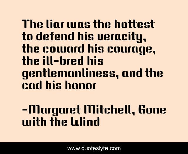 This page presents the quote "The liar was the hottest to defend his veracity, the coward his courage, the ill-bred his gentlemanliness, and the cad his honor". Author of this quote is Margaret Mitchell, Gone with the Wind. This quote is about courage, liar, honor,.