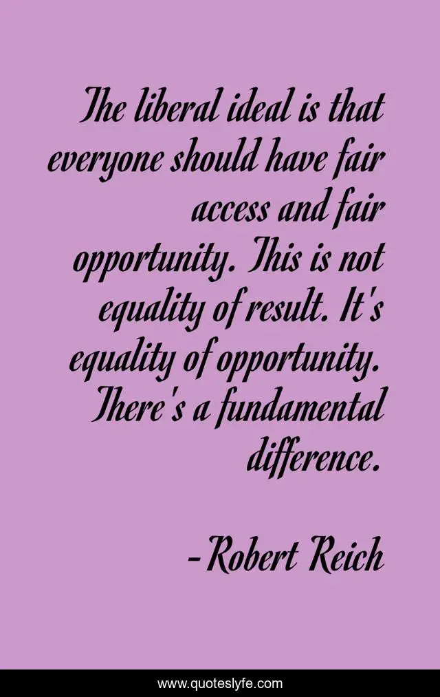 This page presents the quote "The liberal ideal is that everyone should have fair access and fair opportunity. This is not equality of result. It's equality of opportunity. There's a fundamental difference.". Author of this quote is Robert Reich. This quote is about opportunity, liberal,.