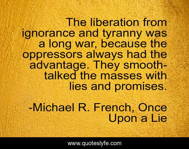 This page presents the quote "The liberation from ignorance and tyranny was a long war, because the oppressors always had the advantage. They smooth-talked the masses with lies and promises.". Author of this quote is Michael R. French, Once Upon a Lie. This quote is about tyranny, promises, oppressors, masses, libration, ignorance, lies, tyranny-of-majority, war,.