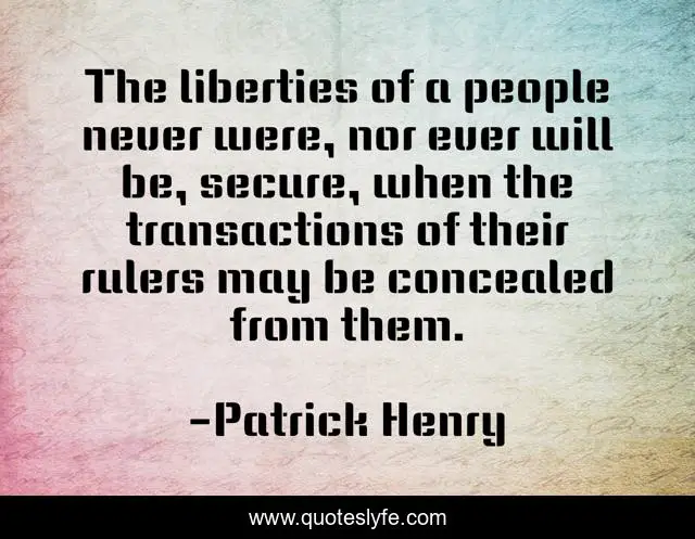 This page presents the quote "The liberties of a people never were, nor ever will be, secure, when the transactions of their rulers may be concealed from them.". Author of this quote is Patrick Henry. This quote is about may, people,.