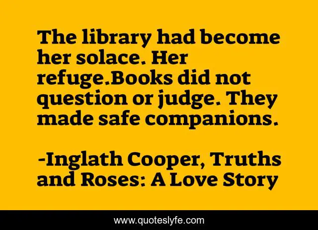 This page presents the quote "The library had become her solace. Her refuge.Books did not question or judge. They made safe companions.". Author of this quote is Inglath Cooper, Truths and Roses: A Love Story. This quote is about books, library, refuge,.
