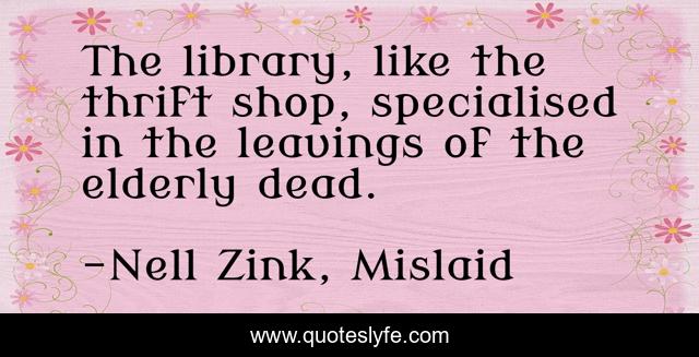 This page presents the quote "The library, like the thrift shop, specialised in the leavings of the elderly dead.". Author of this quote is Nell Zink, Mislaid. .