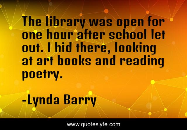 This page presents the quote "The library was open for one hour after school let out. I hid there, looking at art books and reading poetry.". Author of this quote is Lynda Barry. This quote is about school, reading, art,.