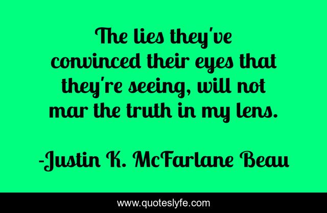 This page presents the quote "The lies they've convinced their eyes that they're seeing, will not mar the truth in my lens.". Author of this quote is Justin K. McFarlane Beau. This quote is about insight, lies, truth, veritas, fools, vision,.