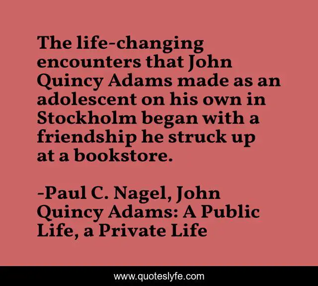 This page presents the quote "The life-changing encounters that John Quincy Adams made as an adolescent on his own in Stockholm began with a friendship he struck up at a bookstore.". Author of this quote is Paul C. Nagel, John Quincy Adams: A Public Life, a Private Life. This quote is about openness, providence-of-god, curiosity,.