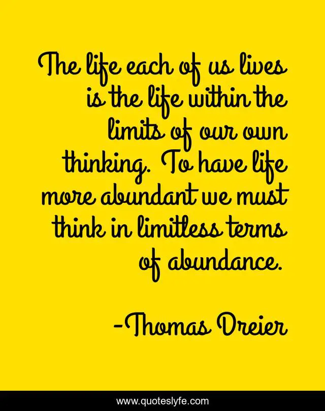 This page presents the quote "The life each of us lives is the life within the limits of our own thinking. To have life more abundant we must think in limitless terms of abundance.". Author of this quote is Thomas Dreier. This quote is about positive, confidence,.