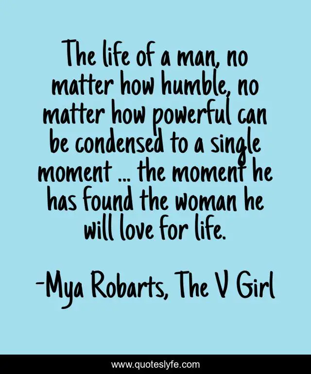 This page presents the quote "The life of a man, no matter how humble, no matter how powerful can be condensed to a single moment ... the moment he has found the woman he will love for life.". Author of this quote is Mya Robarts, The V Girl. This quote is about man-in-love, love, affection, man,.