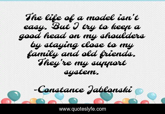 This page presents the quote "The life of a model isn't easy. But I try to keep a good head on my shoulders by staying close to my family and old friends. They're my support system.". Author of this quote is Constance Jablonski. This quote is about life, good, friends,.