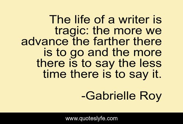 This page presents the quote "The life of a writer is tragic: the more we advance the farther there is to go and the more there is to say the less time there is to say it.". Author of this quote is Gabrielle Roy. This quote is about writers, writing,.