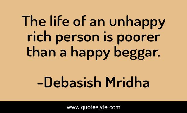 This page presents the quote "The life of an unhappy rich person is poorer than a happy beggar.". Author of this quote is Debasish Mridha. This quote is about rich-person, unhappy-people, happy-beggar, philosophy, debasish-mridha, quotes, debasish-mridha-md, inspirational, enthusiasm,.