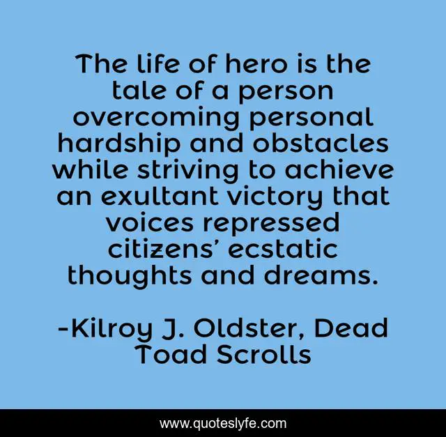 This page presents the quote "The life of hero is the tale of a person overcoming personal hardship and obstacles while striving to achieve an exultant victory that voices repressed citizens’ ecstatic thoughts and dreams.". Author of this quote is Kilroy J. Oldster, Dead Toad Scrolls. This quote is about hero, hardship, striving-for-greatness, myths, heroes, mythology, striving, hardship-overcome, strive,.