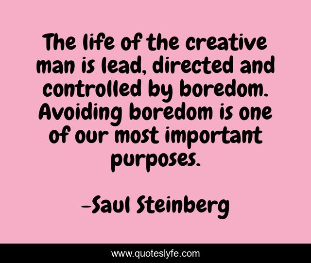 This page presents the quote "The life of the creative man is lead, directed and controlled by boredom. Avoiding boredom is one of our most important purposes.". Author of this quote is Saul Steinberg. This quote is about creativity, boredom,.