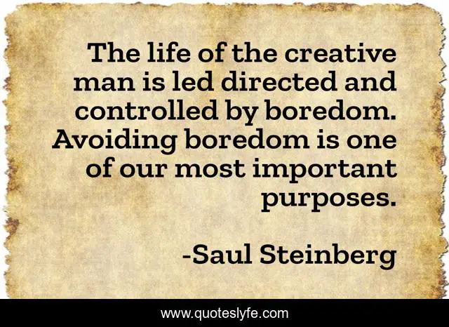 This page presents the quote "The life of the creative man is led directed and controlled by boredom. Avoiding boredom is one of our most important purposes.". Author of this quote is Saul Steinberg. This quote is about creation, creativity,.
