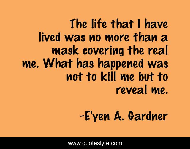 This page presents the quote "The life that I have lived was no more than a mask covering the real me. What has happened was not to kill me but to reveal me.". Author of this quote is E'yen A. Gardner. This quote is about mask, spiritual-life, inspirational, truth, enthusiasm,.