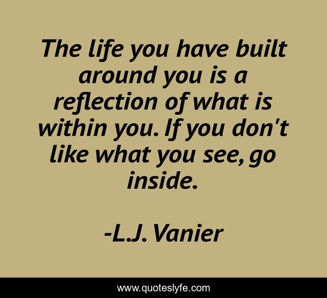 This page presents the quote "The life you have built around you is a reflection of what is within you. If you don't like what you see, go inside.". Author of this quote is L.J. Vanier. This quote is about life-reflection, life-lessons,.