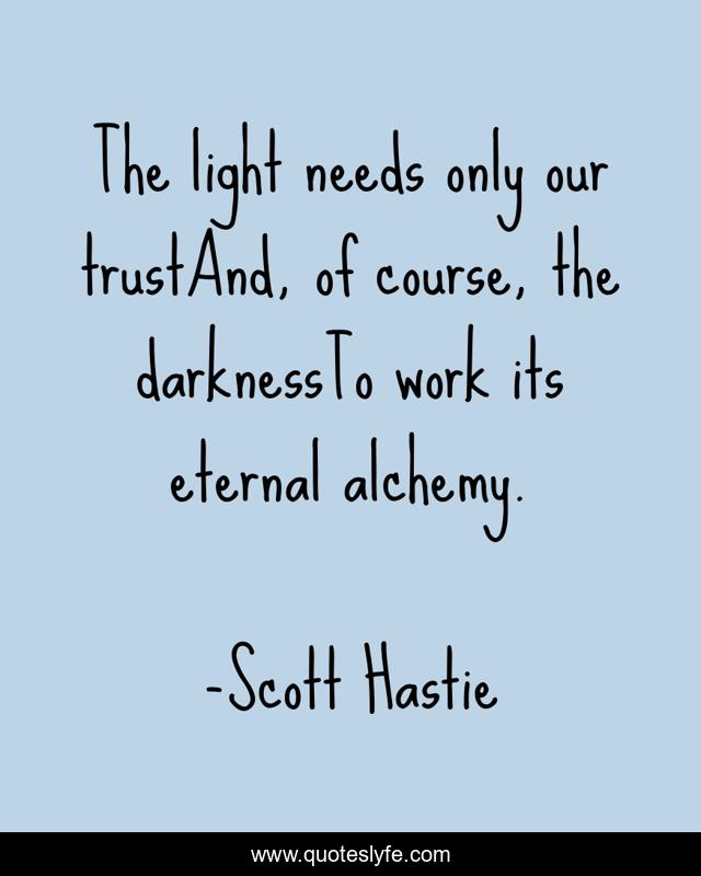 This page presents the quote "The light needs only our trustAnd, of course, the darknessTo work its eternal alchemy.". Author of this quote is Scott Hastie. This quote is about poem, life, darkness, light, trusting, work, eternal, spiritual, wisdom,.