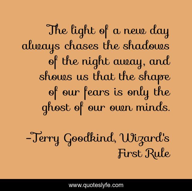 This page presents the quote "The light of a new day always chases the shadows of the night away, and shows us that the shape of our fears is only the ghost of our own minds.". Author of this quote is Terry Goodkind, Wizard's First Rule. This quote is about goodkind, fear,.
