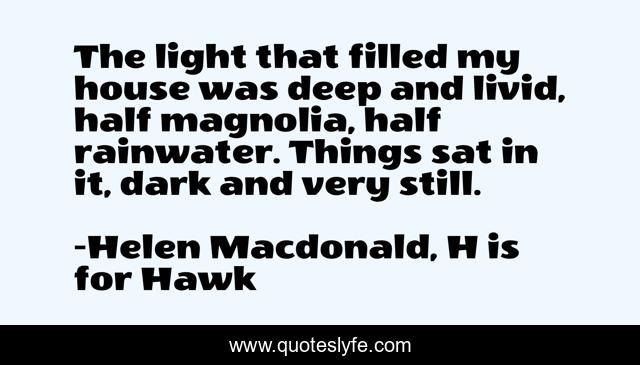 This page presents the quote "The light that filled my house was deep and livid, half magnolia, half rainwater. Things sat in it, dark and very still.". Author of this quote is Helen Macdonald, H is for Hawk. This quote is about light, change, depression,.