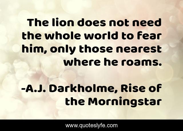This page presents the quote "The lion does not need the whole world to fear him, only those nearest where he roams.". Author of this quote is A.J. Darkholme, Rise of the Morningstar. This quote is about people, others, influence, authority, lion, perspective, fear, confidence, destiny,.