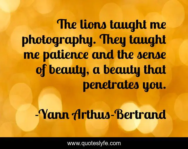 This page presents the quote "The lions taught me photography. They taught me patience and the sense of beauty, a beauty that penetrates you.". Author of this quote is Yann Arthus-Bertrand. This quote is about me, photography, beauty,.