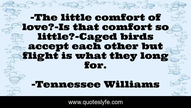 This page presents the quote "-The little comfort of love?-Is that comfort so little?-Caged birds accept each other but flight is what they long for.". Author of this quote is Tennessee Williams. This quote is about freedom, love, affection,.