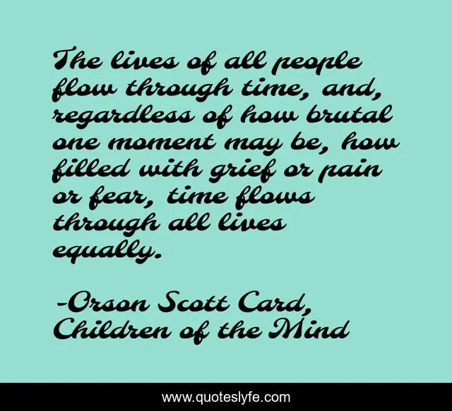 This page presents the quote "The lives of all people flow through time, and, regardless of how brutal one moment may be, how filled with grief or pain or fear, time flows through all lives equally.". Author of this quote is Orson Scott Card, Children of the Mind. This quote is about grief, fear, pain, time-passing, time,.