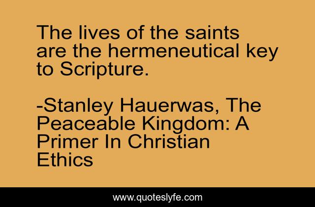 This page presents the quote "The lives of the saints are the hermeneutical key to Scripture.". Author of this quote is Stanley Hauerwas, The Peaceable Kingdom: A Primer In Christian Ethics. This quote is about saints, hermeneutics, theology,.