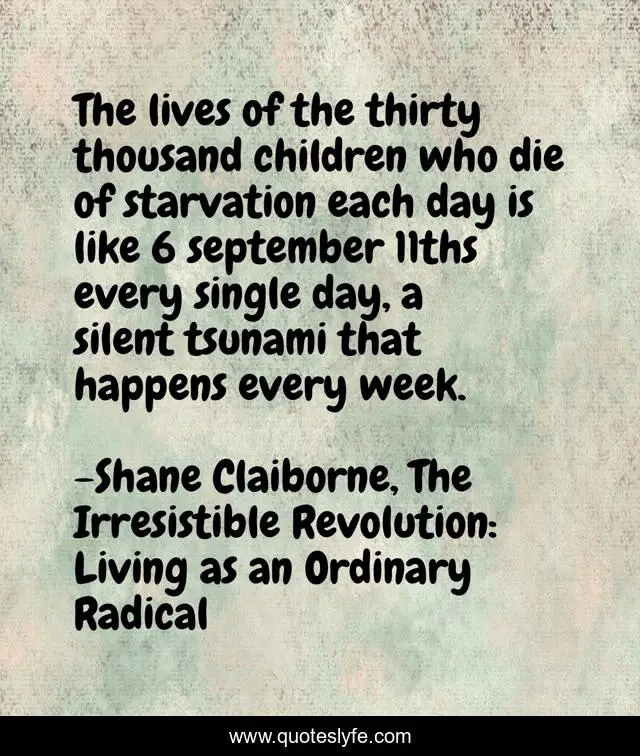 This page presents the quote "The lives of the thirty thousand children who die of starvation each day is like 6 september 11ths every single day, a silent tsunami that happens every week.". Author of this quote is Shane Claiborne, The Irresistible Revolution: Living as an Ordinary Radical. This quote is about september-11th, poverty,.