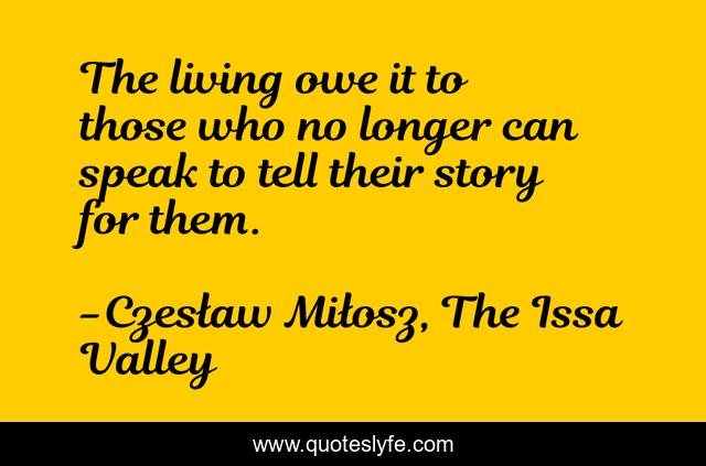 This page presents the quote "The living owe it to those who no longer can speak to tell their story for them.". Author of this quote is Czesław Miłosz, The Issa Valley. This quote is about remembrance, living, reminiscence, dead,.