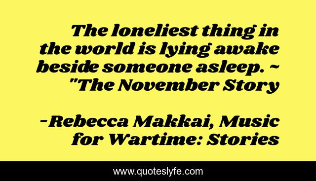 This page presents the quote "The loneliest thing in the world is lying awake beside someone asleep. ~ "The November Story". Author of this quote is Rebecca Makkai, Music for Wartime: Stories. This quote is about love, loneliness, insomnia, husband, partner, spouse, affection,.
