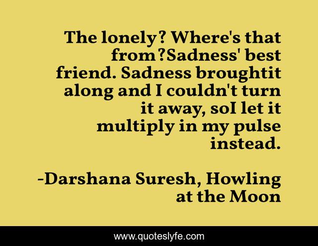 This page presents the quote "The lonely? Where's that from?Sadness' best friend. Sadness broughtit along and I couldn't turn it away, soI let it multiply in my pulse instead.". Author of this quote is Darshana Suresh, Howling at the Moon. This quote is about loneliness, sadness,.
