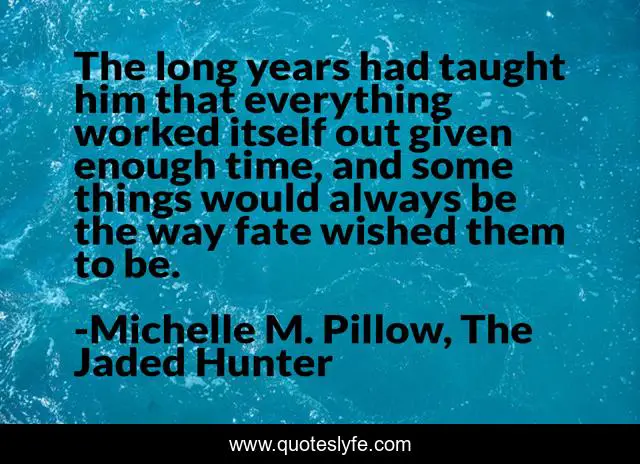 This page presents the quote "The long years had taught him that everything worked itself out given enough time, and some things would always be the way fate wished them to be.". Author of this quote is Michelle M. Pillow, The Jaded Hunter. This quote is about fate, life-lessons,.