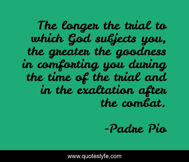 This page presents the quote "The longer the trial to which God subjects you, the greater the goodness in comforting you during the time of the trial and in the exaltation after the combat.". Author of this quote is Padre Pio. This quote is about god, suffering, comfort,.