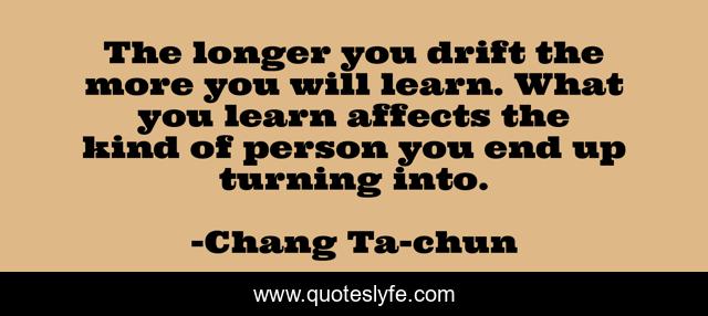 This page presents the quote "The longer you drift the more you will learn. What you learn affects the kind of person you end up turning into.". Author of this quote is Chang Ta-chun. This quote is about travel, learning, drifting,.