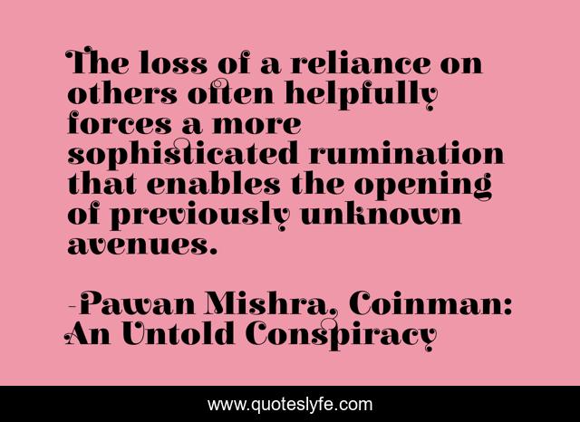This page presents the quote "The loss of a reliance on others often helpfully forces a more sophisticated rumination that enables the opening of previously unknown avenues.". Author of this quote is Pawan Mishra, Coinman: An Untold Conspiracy. This quote is about confidence, self-independence, ability, leading, new-avenues, ideas, reliance, search, independence,.