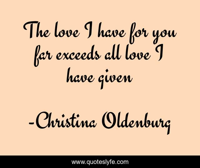 This page presents the quote "The love I have for you far exceeds all love I have given". Author of this quote is Christina Oldenburg. This quote is about love, soulmates, euphoria, marriage, unconditional-love, affection,.