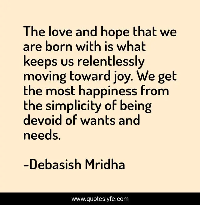 This page presents the quote "The love and hope that we are born with is what keeps us relentlessly moving toward joy. We get the most happiness from the simplicity of being devoid of wants and needs.". Author of this quote is Debasish Mridha. This quote is about simplicity, love, simplicity-of-being, joy, philosophy, debasish-mridha, quotes, hope, inspirational,.