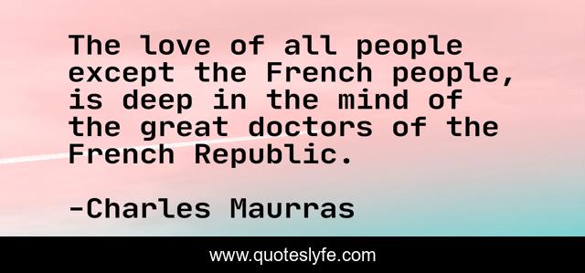 This page presents the quote "The love of all people except the French people, is deep in the mind of the great doctors of the French Republic.". Author of this quote is Charles Maurras. This quote is about french-republic, france, people,.