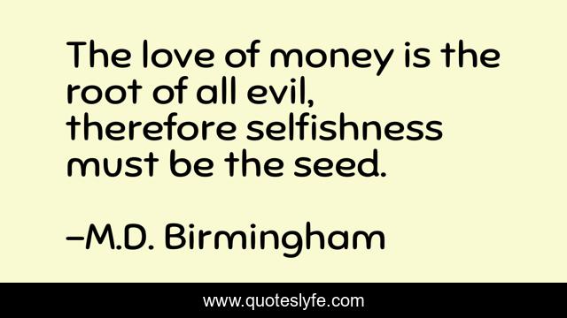 This page presents the quote "The love of money is the root of all evil, therefore selfishness must be the seed.". Author of this quote is M.D. Birmingham. This quote is about body, family, philosophy, mind, soul, handicapped, self-improvement, inspirational, enthusiasm,.